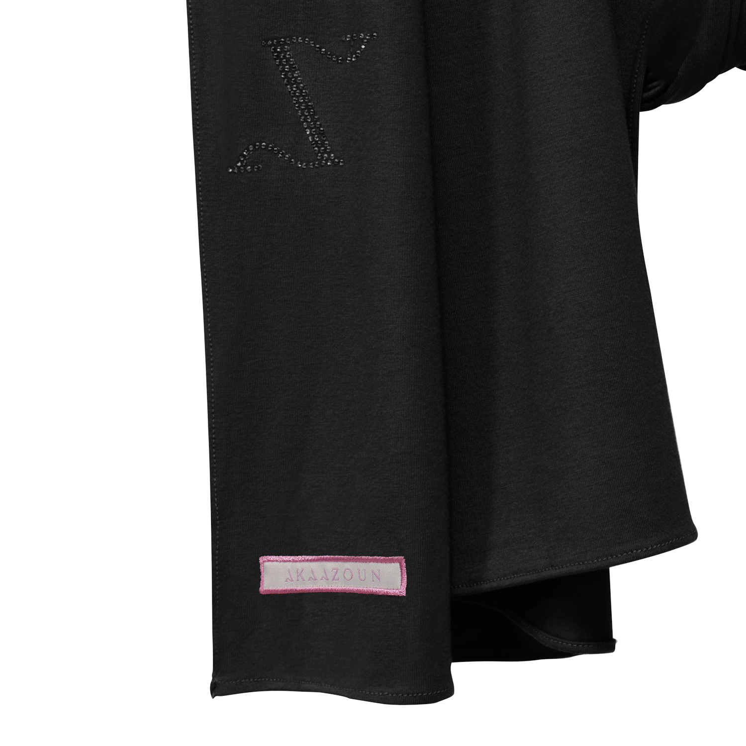 One side is finished with our signature brand details, featuring a subtle label and delicate stone embellishments that add a touch of understated luxury.